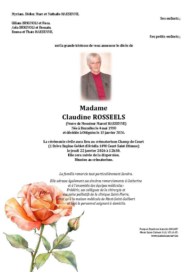 Condoléances Madame ROSSEELS Claudine Née à Bruxelles le 04 mai 1938 et décédée à Ottignies le 13 janvier 2026 à 87 ans.Télécharger le Faire-part (PDF) Laissez votre message de condoléances