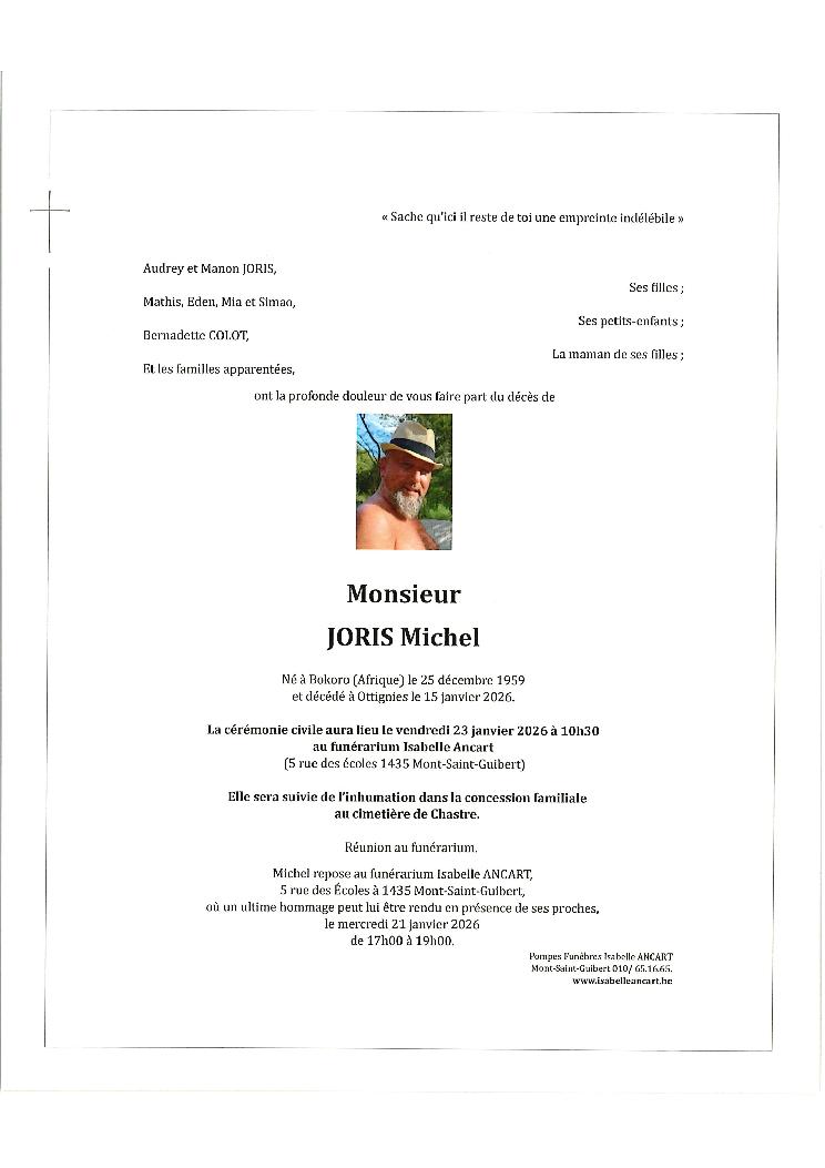 Condoléances Monsieur JORIS Michel Né à Bokoro (Afrique) le 25 décembre 1959 et décédé à Ottignies le 15 janvier 2026 à 66 ans.Télécharger le Faire-part (PDF) Laissez votre message de condoléances